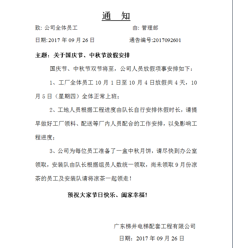 【 關(guān)于廣東梯井“國慶中秋”雙佳節(jié)放假時間安排的通知】